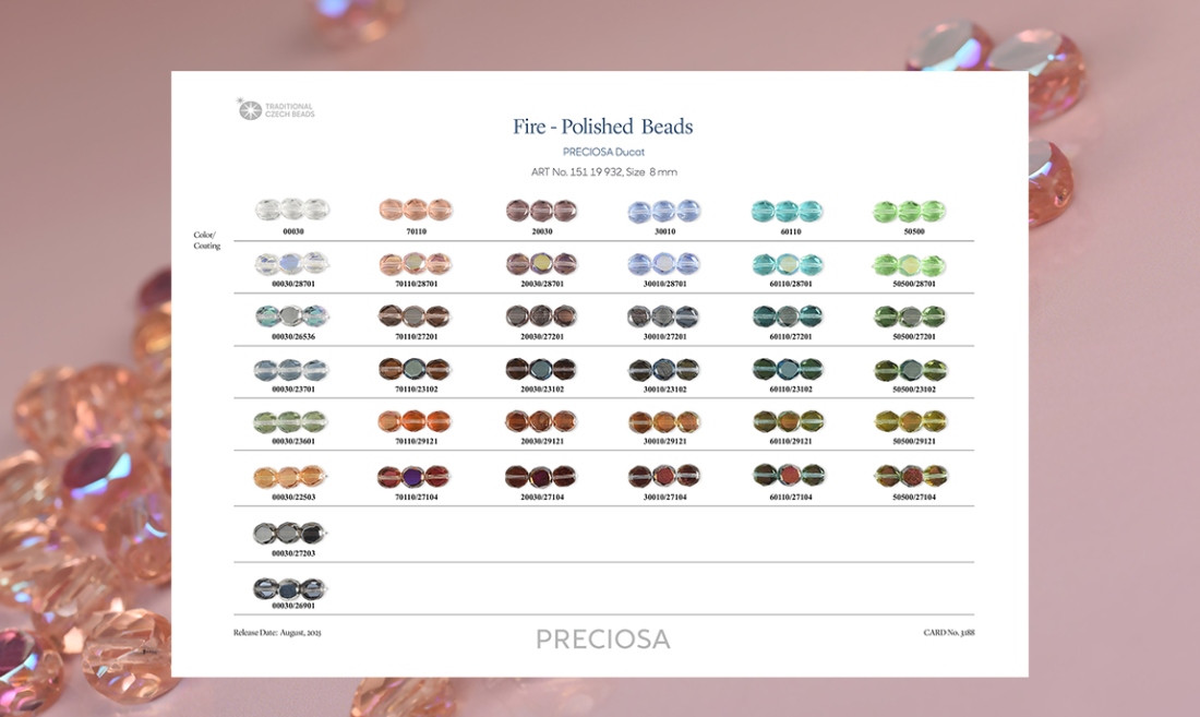 Prohlédněte si karty nejnovějších tvarů a barevných odstínů perlí a perliček se značkou PRECIOSA Traditional Czech Beads™.