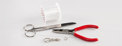 Kovový kroužek provlékněte očkem z modrého rokajlu a spojte s karabinou.