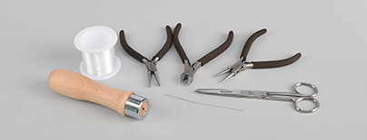 A 0.25 mm nylon line; a thin needle; scissors; snipping pliers; round/cylinder-nosed pliers; possibly needle-nosed pliers that are a combination of the previous pliers; flat-nosed pliers; a file handle